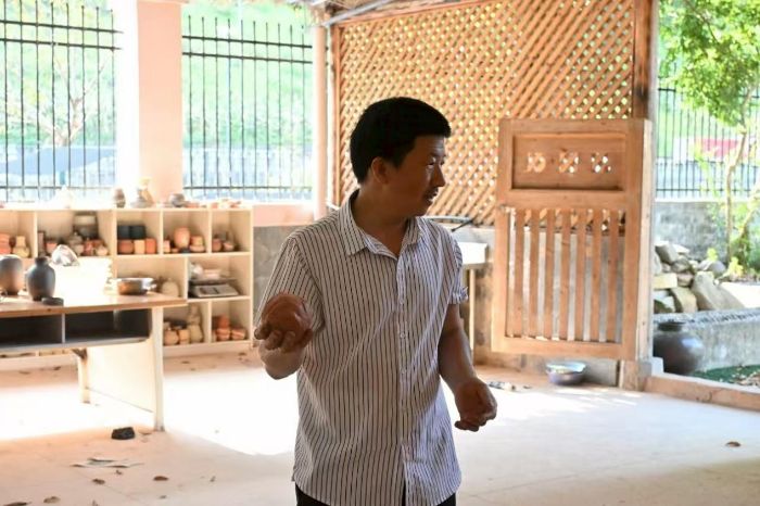 滄溝鄉(xiāng)的土陶制作技藝是當?shù)卣滟F的非遺財富,一件件陶器在指尖流轉(zhuǎn)間沉淀著歲月的印記與代代匠人的巧思。此次實踐團特意來到位于滄溝鄉(xiāng)中心小學校的土陶制作工坊,在土陶制作師傅——左昌林老師的帶領下,探尋這門古老技藝背后的堅守與傳承。