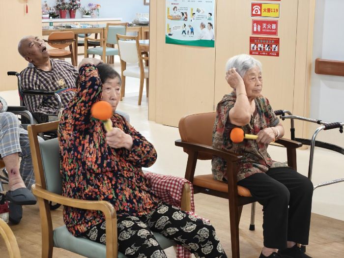 (團(tuán)隊(duì)成員帶領(lǐng)老人做手指操)