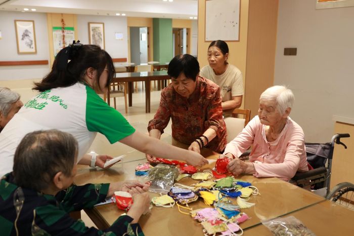 最受期待的“巾藥福袋”制作環(huán)節(jié)將氣氛推向高潮。學(xué)子們提前備好了艾草、薄荷等具有安神、驅(qū)蚊功效的中草藥,以及精美的棉布和彩繩。他們先向老人們介紹每種藥材的作用,隨后一同小心翼翼地將藥材裝入布袋,再用彩繩系出漂亮的結(jié)。百歲老人郭奶奶在學(xué)子們的幫助下也順利完成了香囊制作。蒼老的指尖與年輕的手掌相觸,仿佛完成了一場跨越時(shí)光的溫暖接力。老人們捧著自己親手制作的福袋,臉上洋溢著幸福的笑容。這小小的福袋,承載的不僅是健康的祈愿,更是濃濃的溫情。