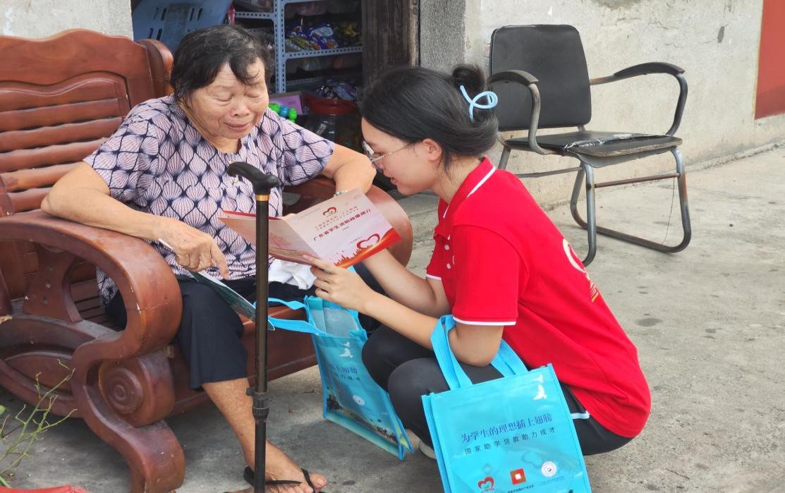 除此之外,隊(duì)員們依托田頭圩內(nèi)主干道這一村民日常出行的重要路徑,開(kāi)展流動(dòng)宣講活動(dòng)。隊(duì)員們沿著主干道緩慢行進(jìn),通過(guò)吆喝資助政策要點(diǎn),同時(shí)隨手配備宣傳資料,向過(guò)往村民面對(duì)面講解資助范圍、申請(qǐng)條件、辦理流程等內(nèi)容,讓惠民政策更直接、更便捷地觸達(dá)每一位村民。遇到街邊納涼的胡姨,我們主動(dòng)遞上《廣東省學(xué)生自主政策簡(jiǎn)介》,簡(jiǎn)單講解“獎(jiǎng)、貸、助、勤、免、補(bǔ)”等八大資助政策。胡姨表示:“這國(guó)家政策好啊,正好我們家里出了兩個(gè)大學(xué)生,我和他們說(shuō)啊。”