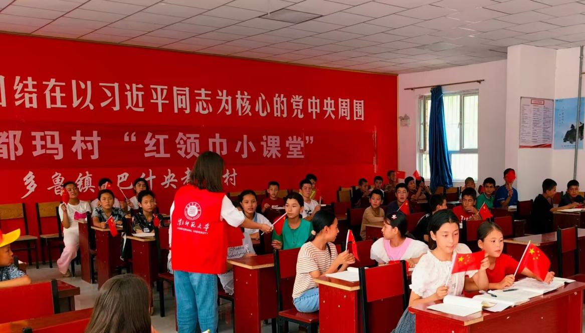 “童心向黨”故事會上,隊員們講述英雄模范事跡,帶領(lǐng)孩子們認(rèn)識國旗國徽,厚植愛國情懷。課程尾聲,隊員與孩子們手持國旗合影,鮮艷的國旗在鄉(xiāng)村院落中飄揚,“愛國愛疆”的種子在童心扎根。