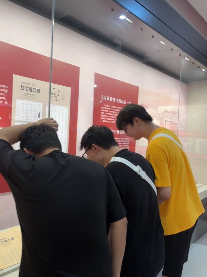 最后我們參觀了紀(jì)念館同學(xué)們依次參觀了各個(gè)展廳。展廳內(nèi),一幅幅珍貴的歷史照片、一件件飽經(jīng)滄桑的革命文物、一段段震撼人心的影像資料,生動(dòng)地再現(xiàn)了革命先烈們?yōu)榱死硐胄拍?,拋頭顱、灑熱血的英勇事跡。在“用鐵锨戰(zhàn)斗到最后一刻”的展區(qū),講解員講述了一位烈士在戰(zhàn)斗中彈藥耗盡后,毅然拿起鐵锨與敵人展開殊死搏斗,直至壯烈犧牲的故事。同學(xué)們聽(tīng)后,無(wú)不為之動(dòng)容,對(duì)先烈們的英勇無(wú)畏精神充滿了敬佩。