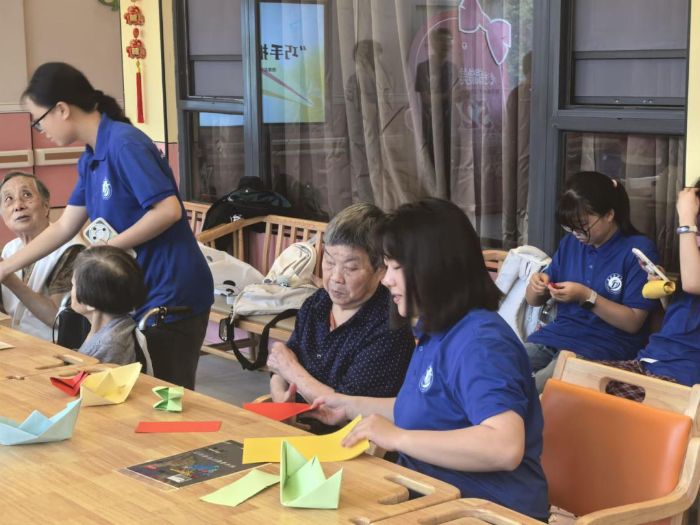 圖為實(shí)踐隊(duì)員在“巧手折生活”創(chuàng)意折紙工坊中一對(duì)一指導(dǎo)老人制作紙鶴。藍(lán)晟銘供圖