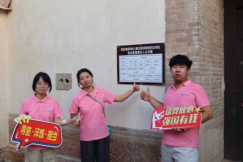 團(tuán)隊(duì)專程前往八路軍總部軍事測繪室河北溝舊址開展現(xiàn)場教學(xué)。舊址前,實(shí)踐團(tuán)成員手持 “請黨放心?強(qiáng)國有我”“尋跡?淬煉?擔(dān)當(dāng)” 的標(biāo)語牌莊嚴(yán)宣誓,鏗鏘誓言回蕩在太行山麓。安全責(zé)任人公示牌前,三位身著統(tǒng)一服裝的隊(duì)員莊重肅立,以肅穆姿態(tài)表達(dá)對革命先輩的崇高敬意,定格下傳承紅色精神的動人瞬間。