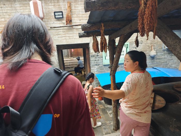 磧口鎮(zhèn)位于黃河岸邊,是名副其實的千年古鎮(zhèn),曾是明清至民國時期晉商往返西北與中原的重要水陸碼頭,商號林立、車水馬龍的盛景孕育了獨(dú)特的晉商文化。隊員們首先來到明清古街的老字號醋坊,在青石板路盡頭的老作坊里,傳統(tǒng)釀醋工藝散發(fā)著時光的醇香。匠人沿用“蒸、酵、熏、淋、陳”的古法工序,將高粱、豌豆、紅棗等原料轉(zhuǎn)化為酸香醇厚的老陳醋。“一勺醋里藏著晉商的誠信與堅守,”醋坊傳承人向隊員們介紹,明清時期晉商以“貨真價實”立市,釀醋如立人,每一步都容不得半點(diǎn)虛浮,這種精益求精的理念也是晉商立足商海的根基。