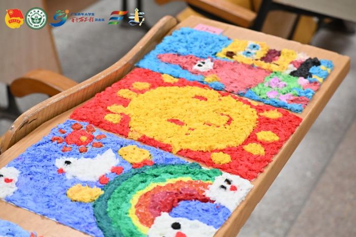 制作紙漿時,突擊隊隊員戴小雨跟同學(xué)們講解,“不同顏色的紙漿要分開存放,尤其是深色和淺色,否則容易串色,影響圖案的清晰度。” 她還示范了膠水的添加比例,當(dāng)膠水與紙漿的比例大概在 1:5時,既能保證粘性,又不會讓作品干后起皺。” 孩子們聽得專注,時不時點(diǎn)頭回應(yīng),手上的動作也更加謹(jǐn)慎。