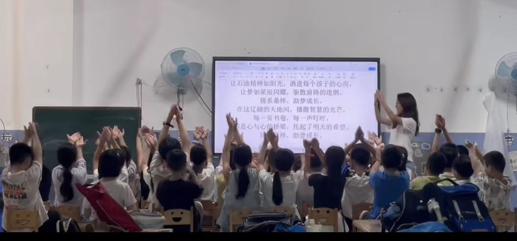 音樂(lè)課上,耿可欣老師帶來(lái)了兩首特殊的歌曲。一首是中國(guó)石油大學(xué)(華東)的校歌,讓孩子們?cè)诟杪曋懈惺艽髮W(xué)的文化底蘊(yùn);另一首則是專為蜀光支教隊(duì)創(chuàng)作的《情系桑梓,助夢(mèng)成長(zhǎng)》,悠揚(yáng)的旋律搭配溫暖的歌詞,唱出了支教老師與孩子們的深厚情誼。孩子們認(rèn)真跟唱,歌聲稚嫩卻充滿力量,為文藝匯演增添了別樣的溫情。