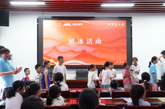 在第二天的開營儀式上,田夢(mèng)支教團(tuán)隊(duì)長葛錦一首先為孩子們介紹田夢(mèng)支教團(tuán)的故事,并為孩子們開展安全第一課。隨后,是各位支教團(tuán)老師的自我介紹和破冰游戲,老師與孩子們間陌生的堅(jiān)冰也在此過程中逐漸消融。在信息登記后發(fā)現(xiàn),到場(chǎng)約有70位孩子,遠(yuǎn)多于預(yù)估的60名孩子,縱使夏日炎炎,也無法阻擋孩子們想?yún)⒓酉牧顮I的熱情。為了提高授課質(zhì)量,緩解管理壓力,支教團(tuán)依據(jù)孩子們的年齡,將其分成低年級(jí)班和高年級(jí)班分別授課。在孩子們充滿期待的眼神和掌聲下,開營儀式圓滿結(jié)束,一段美好的盛夏故事也開始起筆。