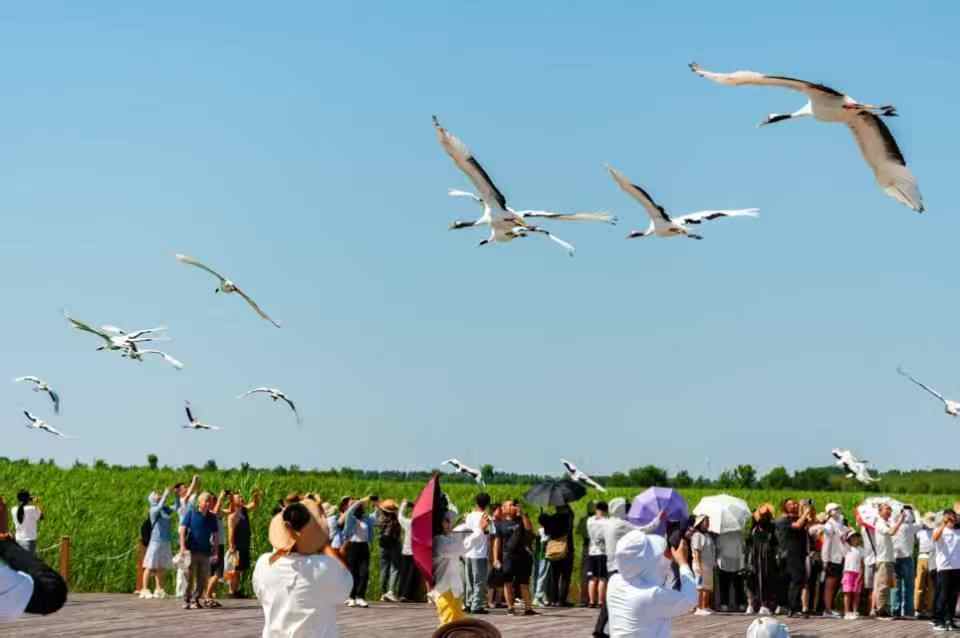 結(jié)束泰來縣的實(shí)踐后,實(shí)踐隊(duì)前往扎龍國家級(jí)自然保護(hù)區(qū)開展?jié)竦厣鷳B(tài)考察。在這片21萬公頃的濕地上,棲息著全球五分之一的丹頂鶴種群。團(tuán)隊(duì)成員此行恰好趕上“丹頂鶴放飛”的環(huán)節(jié),隊(duì)員們認(rèn)真觀察記錄丹頂鶴、白頭鶴、白枕鶴等珍稀動(dòng)物的外觀特征及棲息情況并對濕地保護(hù)知識(shí)有了進(jìn)一步的了解。