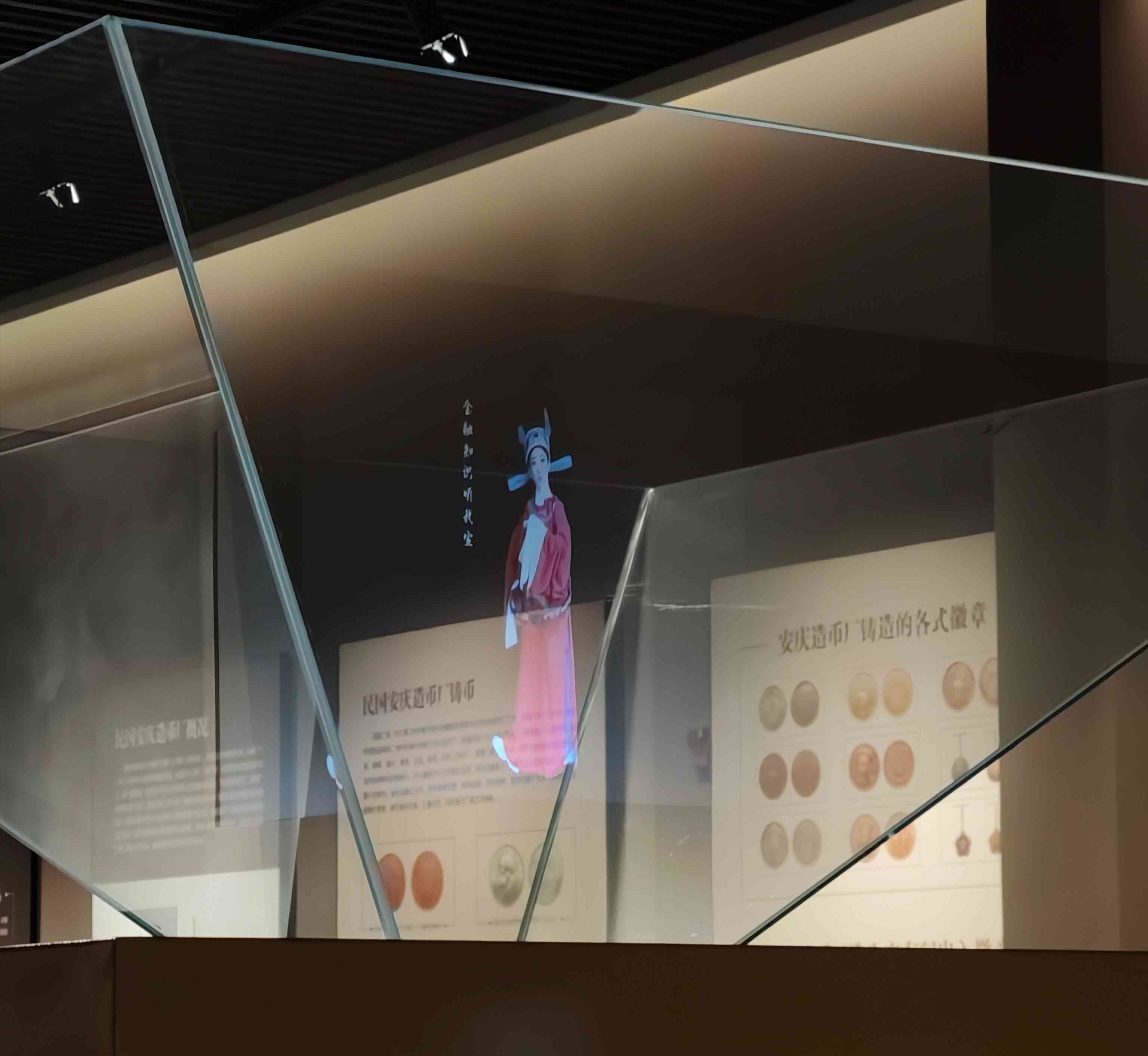 步入相關(guān)展廳,一面特殊的玻璃展柜尤為引人注目。在這看似普通的展柜中,運(yùn)用全息投影等數(shù)字技術(shù),讓文物“活”了起來(lái)。以其中的虛擬人物展示為例,一位身著傳統(tǒng)服飾的虛擬形象出現(xiàn)在展柜之中,伴隨著輕柔的音樂(lè)和講解,仿佛穿越時(shí)空而來(lái),向同學(xué)們娓娓道來(lái)安慶的歷史故事 。