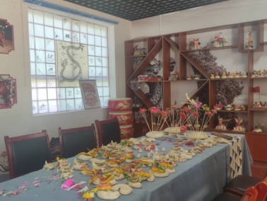 上午 11 時(shí),實(shí)踐團(tuán)成員又奔赴阿黨鎮(zhèn)北村。北村擁有著源遠(yuǎn)流長、豐富深厚的歷史文化底蘊(yùn),這里甚至還有著全省首家村級(jí)文聯(lián)。在北村干部以及霸王鞭傳承人李小亞的引領(lǐng)下,實(shí)踐團(tuán)成員興致勃勃地參觀了北村村史館以及北村抬鼓傳習(xí)所。北村的抬鼓、面花、剪紙、霸王鞭、社火等傳統(tǒng)民間藝術(shù)聲名遠(yuǎn)揚(yáng),在周邊地區(qū)廣受贊譽(yù)。群眾對(duì)于這些傳統(tǒng)藝術(shù)的傳承和學(xué)習(xí)熱情高漲,蔚然成風(fēng)。特別是那獨(dú)具特色的抬鼓,已然成為黃陵文化的重要象征,以及黃帝陵祭典中一張亮麗奪目的名片。