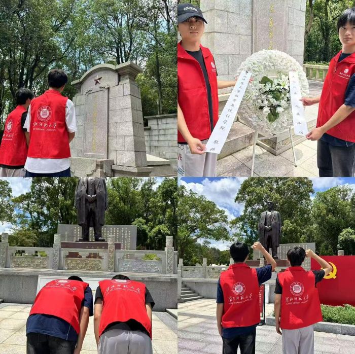 緊接著團隊成員在工作人員的幫助下,代表淮北師范大學數學與統(tǒng)計學院向方志敏烈士陵園獻上花圈。緞帶上的“方志敏烈士永垂不朽”被陽光灼得發(fā)亮。六十秒默哀計時器開啟,挽聯被山風掀起一角,訴說著這段理應萬世銘記的光輝史。