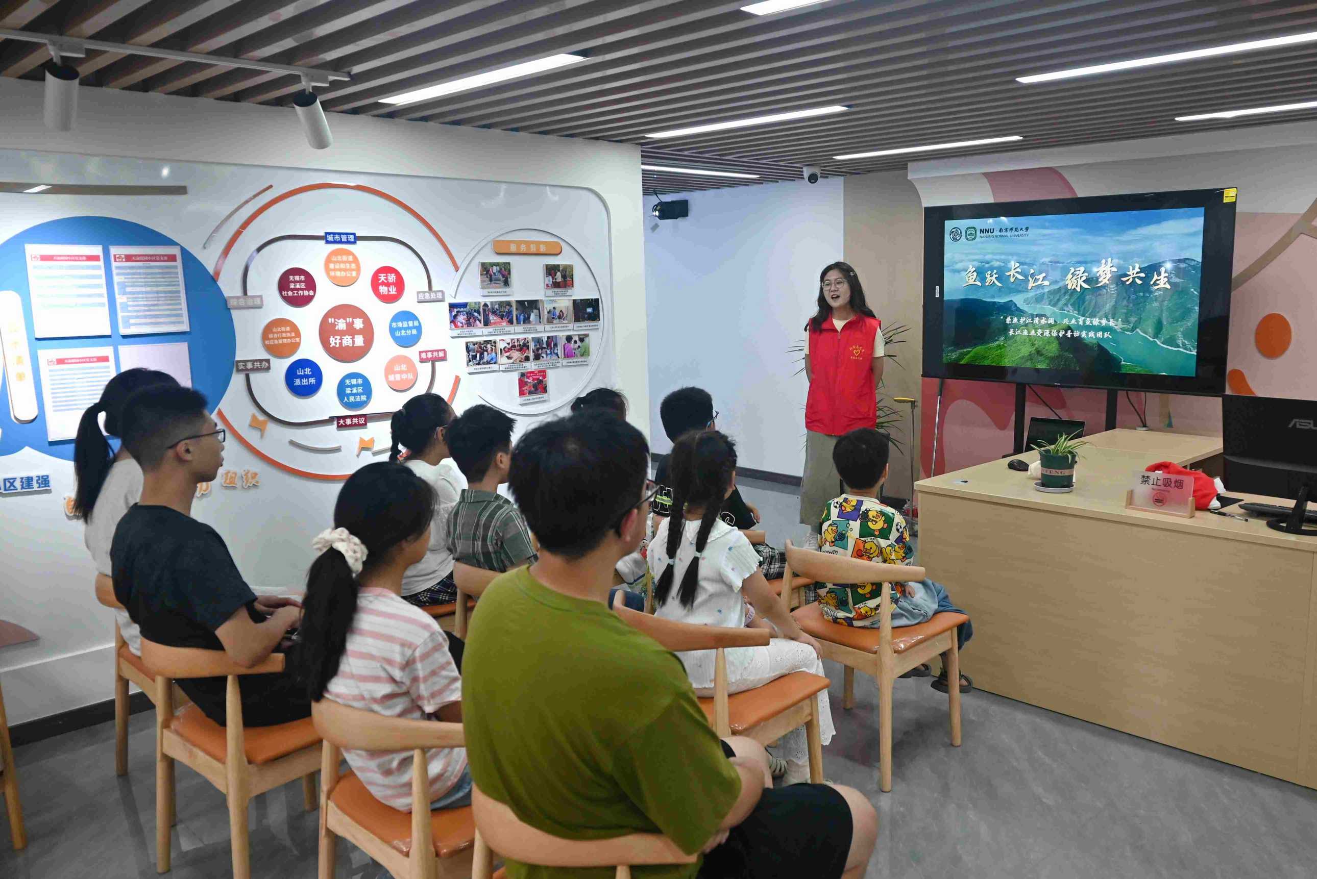 圖為江陰市澄江街道便民中心活動現(xiàn)場,團隊成員和小朋友們就“長江為什么要禁漁”這一問題展開互動。陸佳怡 供圖。