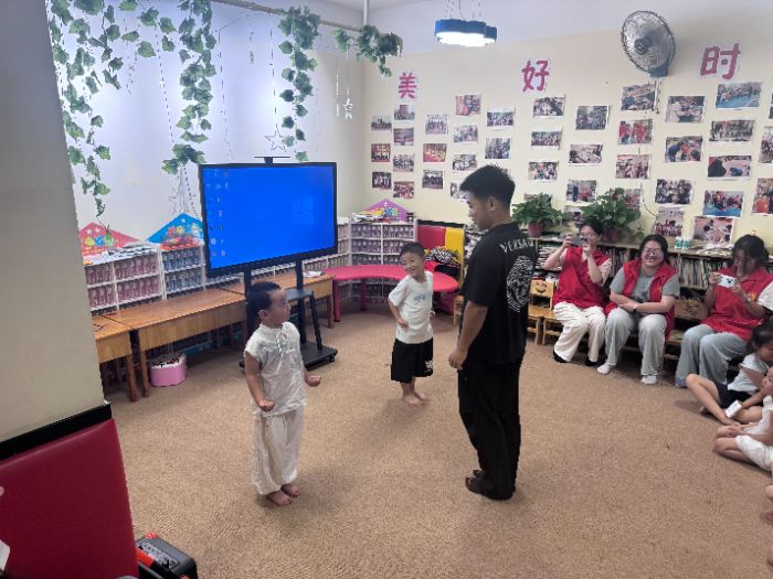 根據(jù)現(xiàn)場情況,實踐團(tuán)在社區(qū)文化廣場開展了文藝表演互動環(huán)節(jié)。實踐團(tuán)成員們帶來的舞蹈《入畫江南》柔美靈動,贏得陣陣掌聲;武術(shù)表演則剛勁有力,拳腳生風(fēng),尤其是成員于曉冉的招式利落灑脫,盡顯蓬勃朝氣。表演結(jié)束后,于曉冉主動走到孩子們中間,耐心教大家扎馬步、出拳等基礎(chǔ)動作,糾正他們的姿勢。