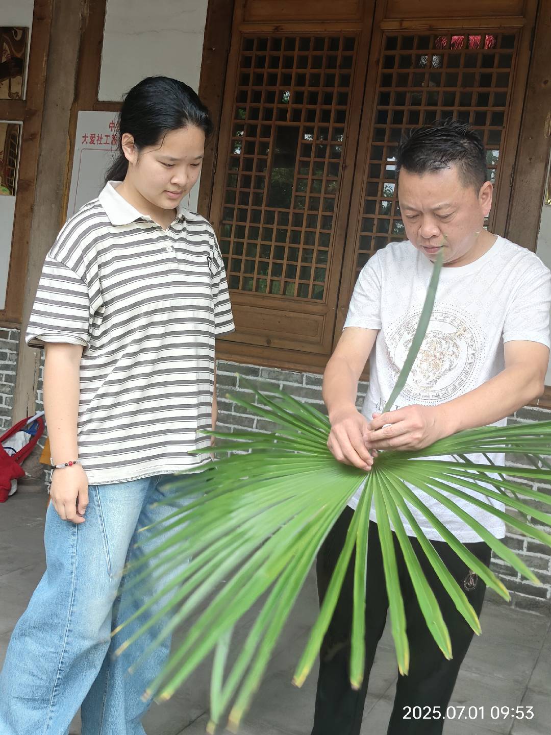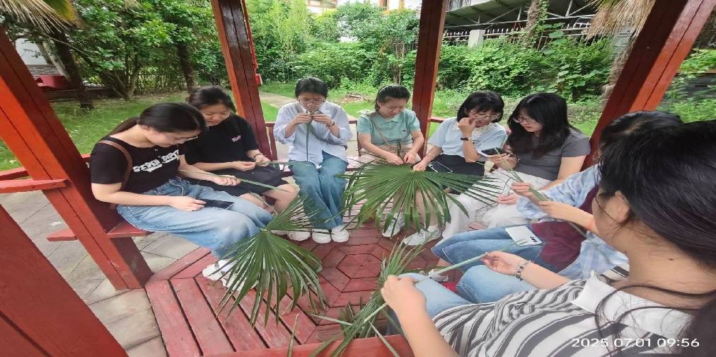 參觀與采訪結(jié)束后,實踐團成員迎來了最期待的環(huán)節(jié) —— 棕編技藝學習。體驗館特別安排了資深棕編老師,為成員們開展 “棕編入門教學”,從棕櫚葉的處理、篾條的撕制,到基礎(chǔ)紋樣的編織,進行耐心細致的指導。?