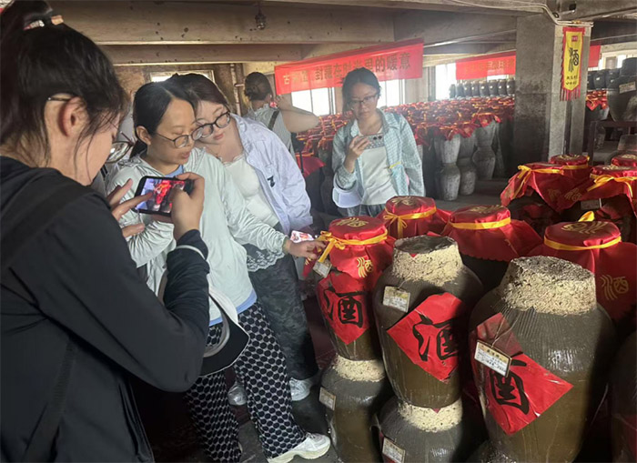 實(shí)踐團(tuán)一行抵達(dá)郎溪后,便馬不停蹄地深入古南豐企業(yè)生產(chǎn)一線。同學(xué)們參觀了古南豐的釀酒車(chē)間、陳釀倉(cāng)庫(kù)以及現(xiàn)代化的灌裝生產(chǎn)線。在釀酒車(chē)間,彌漫的酒香和傳統(tǒng)的釀酒工藝讓同學(xué)們大開(kāi)眼界,師傅們熟練的操作、嚴(yán)格的釀造流程,無(wú)不展現(xiàn)出古南豐對(duì)于品質(zhì)的執(zhí)著追求;陳釀倉(cāng)庫(kù)里,排列整齊的酒壇仿佛訴說(shuō)著歲月的故事,承載著古南豐酒的醇厚與韻味。
