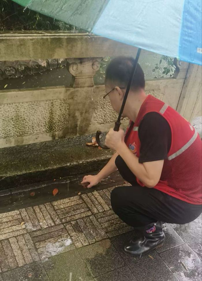 7月下旬,泰州遭遇十年一遇持續(xù)強(qiáng)降雨。清晨6點(diǎn),周橋社區(qū)某網(wǎng)格員已踩著沒(méi)過(guò)腳踝的積水開(kāi)始巡查。“雨越大越要往外跑”,他掀開(kāi)一處窨井蓋,徒手掏出堵塞的枯枝爛葉,渾濁的污水瞬間噴濺上衣襟。