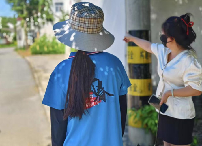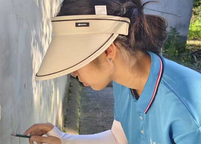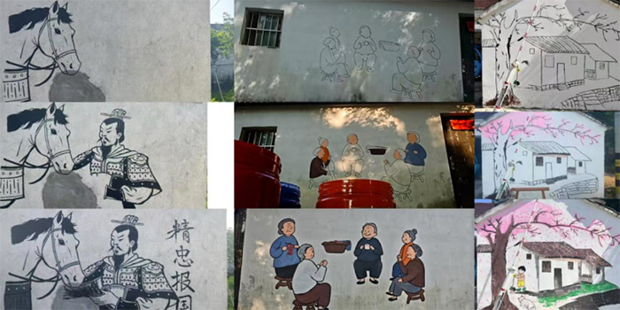 7月3日上午,實(shí)踐團(tuán)隊(duì)到達(dá)十字鎮(zhèn),便與當(dāng)?shù)卮甯刹繉L地點(diǎn)與主題展開親切交流。當(dāng)?shù)卮甯刹繛槌蓡T們詳細(xì)介紹了當(dāng)?shù)氐臍v史文化、農(nóng)耕文化、茶園生態(tài)以及櫻花旅游特色,并帶領(lǐng)她們走訪村落,實(shí)地考感受察村容村貌與見證新時(shí)代鄉(xiāng)村建設(shè)成果。結(jié)合實(shí)地見聞與其特有的文化底蘊(yùn),雙方共同商議明確了墻繪的主題:在古樹下圍繞茶文化繪制一幅村民喝茶閑聊圖,展現(xiàn)茶文化與市井風(fēng)情;在古橋邊圍繞櫻花特色創(chuàng)作一幅櫻花古鎮(zhèn)圖,呼應(yīng)當(dāng)?shù)氐穆糜翁厣?;在古?zhàn)場遺址畫一幅岳飛喂馬圖。傳承歷史記憶。成員們在素材選擇上緊扣鄉(xiāng)村特質(zhì),既尊重當(dāng)?shù)氐奈幕瘋鹘y(tǒng),又融入藝術(shù)創(chuàng)意,每一處細(xì)節(jié)都凝聚著對工作的認(rèn)真態(tài)度與助力鄉(xiāng)村建設(shè)的熱忱,為后續(xù)墻繪筑牢了基礎(chǔ)。