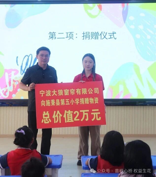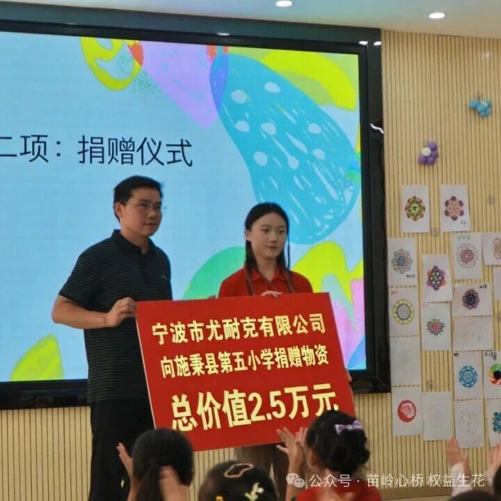 在隨后舉行的捐贈儀式上,寧波市尤耐克有限公司和寧波大狼窗飾有限公司分別向?qū)W校捐贈了價值2.5萬元和2萬元的教學(xué)物資,這些物資將用于改善學(xué)校的辦學(xué)條件。校方代表與實踐隊共同完成了捐贈物資的交接工作。