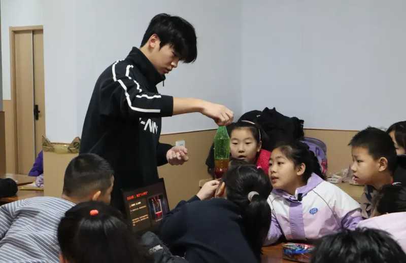 圖為隊(duì)員向孩子們演示“油水火山”實(shí)驗(yàn) 郝一諾 供圖