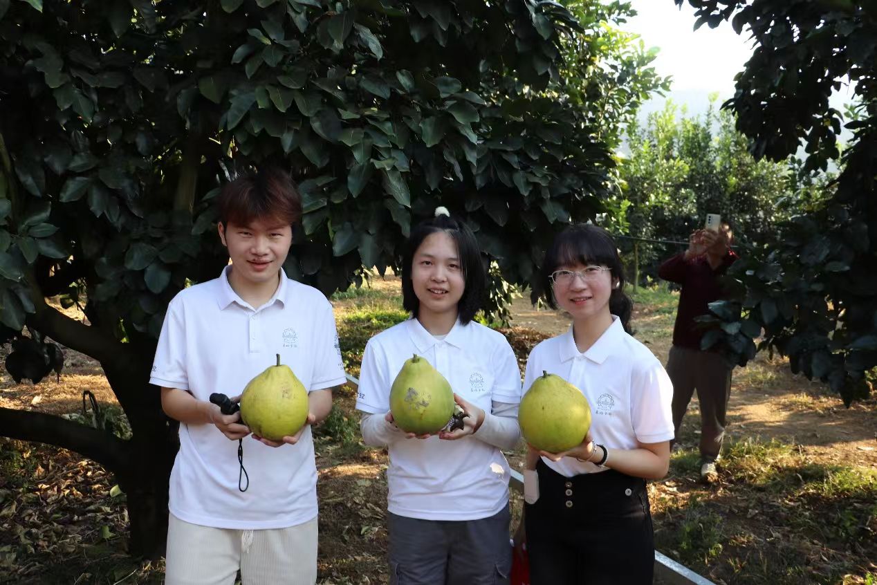 當日下午,實踐隊走進南福金柚種植基地,漫山遍野的柚樹郁郁蔥蔥,沉甸甸的金柚掛滿枝頭,農(nóng)戶們正忙著采摘、分揀、打包,一派豐收繁忙的景象?;刎撠熑讼驇熒鷤兘榻B:“在鄉(xiāng)村振興政策扶持下,我們不僅擴大了種植規(guī)模,還打造了金柚深加工產(chǎn)業(yè)鏈,產(chǎn)品遠銷全國各地,帶動了周邊200多戶村民增收。” 師生們走進柚田,與農(nóng)戶面對面交流,親手體驗金柚采摘,詳細了解金柚種植技術(shù)、產(chǎn)業(yè)運營模式和惠農(nóng)政策落實情況。看著農(nóng)戶們臉上洋溢的幸福笑容,實踐隊指導(dǎo)老師鄭佳宜表示:“一顆金柚,串起了產(chǎn)業(yè)興旺與民生幸福,這正是鄉(xiāng)村振興戰(zhàn)略在梅州落地見效的生動縮影,也讓我們真切感受到總書記對民生福祉的深切牽掛。”