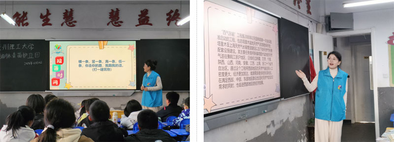 活動(dòng)開場(chǎng),宣講團(tuán)成員鄧嬌別出心裁地以一則謎語開啟此次意義深遠(yuǎn)的管道保護(hù)之旅,成功吸引了小學(xué)生們的目光,點(diǎn)燃了他們的好奇心與參與熱情。在隨后的小課堂上篇,鄧嬌憑借色彩斑斕的圖片與妙趣橫生的動(dòng)畫視頻,生動(dòng)形象地向同學(xué)們展示了管道的多樣種類以及我國(guó)宏偉的西氣東輸工程,讓孩子們對(duì)平日里鮮有接觸的管道設(shè)施有了全新的認(rèn)識(shí)與濃厚的興趣,課堂氣氛活躍非凡。