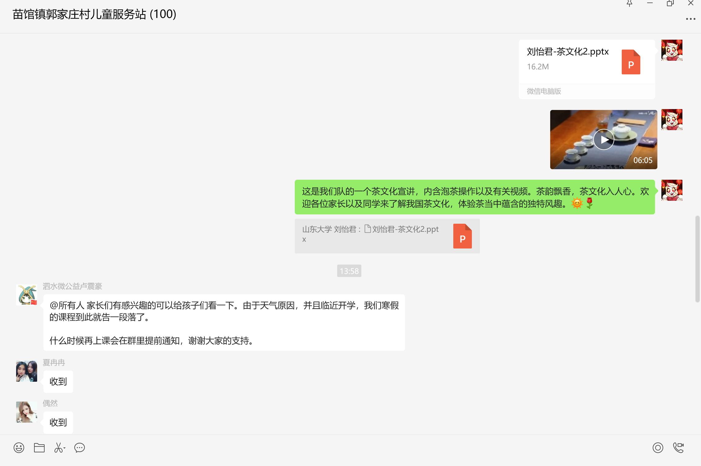 中午,隊(duì)員們將PPT、視頻等資料發(fā)到了家長群中,并告訴學(xué)生們在觀看資料之后可隨時(shí)與老師交流感想,如有疑問可私信詢問老師或者在群里提出。過了一會兒,有一位同學(xué)在群里提出了問題:“為什么泡茶前需要溫杯?”隊(duì)員們詳細(xì)進(jìn)行了解答。一石激起千層浪,在此條消息發(fā)布之后,學(xué)生們出乎意料地積極進(jìn)行了討論,尤其對泡茶中的禮儀表現(xiàn)出興趣??吹綄W(xué)生們對茶文化如此感興趣,隊(duì)員們的心中也暖暖的。家長們對此也喜聞樂見。當(dāng)然,也有幾個(gè)學(xué)生比較害羞,選擇私信詢問老師,隊(duì)員們在耐心解答的同時(shí)也鼓勵(lì)他們與其他學(xué)生進(jìn)行交流,他們隨后也加入了群聊的討論。