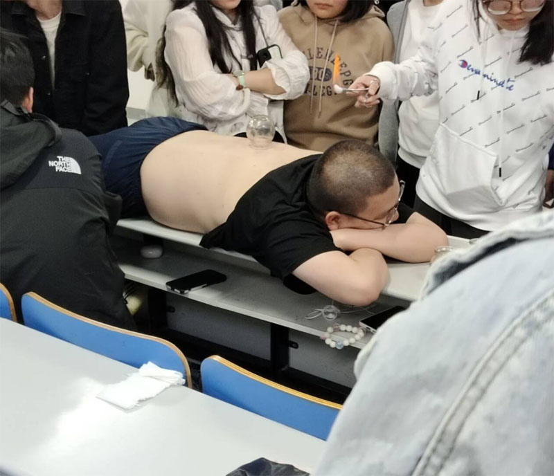 圖為宣講團在現(xiàn)場演示拔火罐技法。大學(xué)生之聲網(wǎng)通訊員 顧忠陽 攝