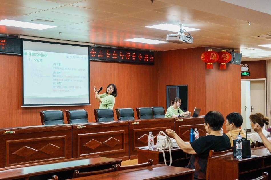 隨后,實(shí)踐團(tuán)另一位講師付欣然結(jié)合自身食品營養(yǎng)與健康專業(yè)知識背景,為社區(qū)居民帶來了一場養(yǎng)心保健穴位教學(xué)。她耐心細(xì)致地講解了穴位的位置及按摩方法,并通過示范,手把手教大家如何準(zhǔn)確找到并按摩養(yǎng)心穴位。參與宣講的社區(qū)居民紛紛嘗試,現(xiàn)場氣氛熱烈。