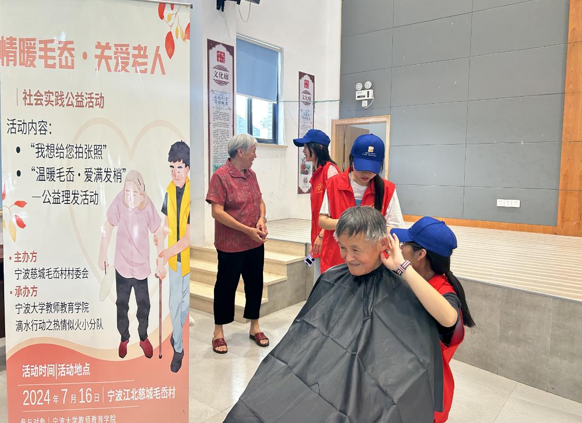 2024年7月19日,為促進(jìn)鄉(xiāng)村振興事業(yè)蓬勃發(fā)展,寧波大學(xué)聚焦農(nóng)村養(yǎng)老,組織教師教育學(xué)院多名大學(xué)生志愿者組成“滴水行動(dòng) 熱情似火”社會(huì)實(shí)踐隊(duì),前往寧波市慈城縣毛岙村開展一場(chǎng)以“情暖毛岙·關(guān)愛老人”為主題的敬老愛老公益活動(dòng)。實(shí)踐隊(duì)以毛岙村文化禮堂為根據(jù)地,制定了匠藝精修,容光煥發(fā)—義剪、雅韻鏡前,定格歲月—義拍、情暖人間,慰問傳愛—義訪等一系列圍繞敬老愛老為核心的行動(dòng)計(jì)劃。本次社會(huì)實(shí)踐活動(dòng)旨在改變目前老人精神物質(zhì)生活環(huán)境,促進(jìn)老年人進(jìn)一步融入社會(huì),積極生活,“滴水行動(dòng) 熱情似火”社會(huì)實(shí)踐小分隊(duì)開展系列活動(dòng)。