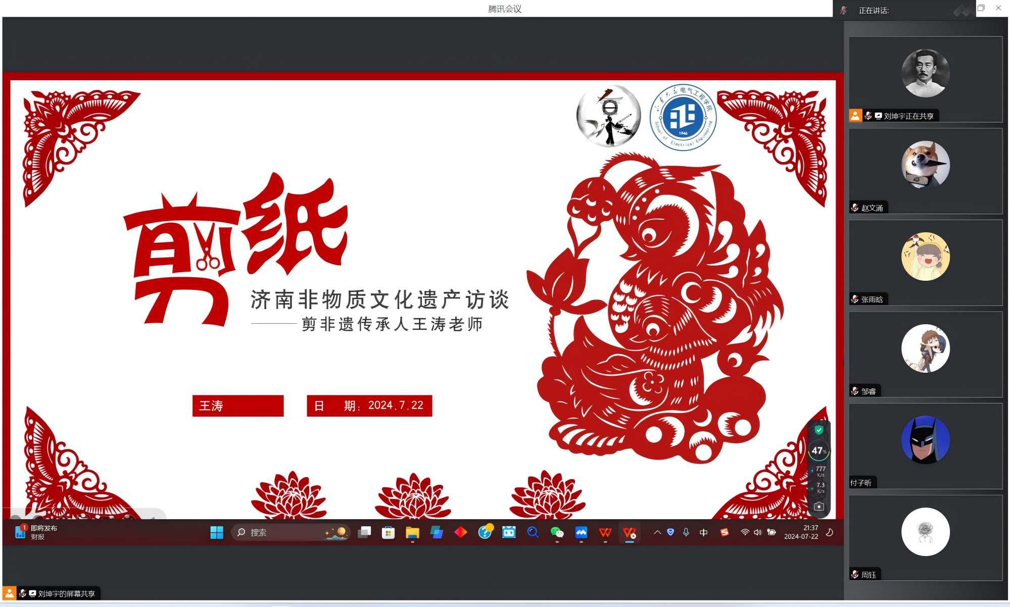 7月22日,山東大學(xué)電氣工程學(xué)院“E韻非遺夢(mèng)相承”社會(huì)實(shí)踐隊(duì)成功與濟(jì)南剪紙傳承人王濤老師展開線上會(huì)談,王濤老師欣然接受團(tuán)隊(duì)的邀請(qǐng)并表示:看到越來越多的新一代青年人重新燃起對(duì)傳統(tǒng)文化的熱情,他倍感欣慰同時(shí)動(dòng)力滿滿。