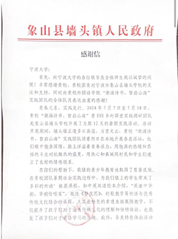 在兩年良好合作基礎(chǔ)上,寧波大學(xué)外國(guó)語(yǔ)學(xué)院與墻頭學(xué)校就設(shè)立暑期社會(huì)實(shí)踐與志愿服務(wù)基地授牌,雙方將在未來(lái)進(jìn)一步加強(qiáng)合作,共同推動(dòng)教育與社會(huì)的深度融合;同時(shí),墻頭鎮(zhèn)團(tuán)委林昊楠書(shū)記及鄉(xiāng)政府代表向團(tuán)隊(duì)致以感謝信,對(duì)他們?cè)趬︻^鎮(zhèn)所做的積極貢獻(xiàn)和無(wú)私奉獻(xiàn)表示高度贊揚(yáng)和誠(chéng)摯感謝。他們表示,將一如既往地支持寧波大學(xué)外國(guó)語(yǔ)學(xué)院的社會(huì)實(shí)踐活動(dòng),為團(tuán)隊(duì)成員們提供更多更好的實(shí)踐機(jī)會(huì)和平臺(tái),共同探索更多創(chuàng)新性的社會(huì)實(shí)踐項(xiàng)目,為培養(yǎng)更多具有社會(huì)責(zé)任感和實(shí)踐能力的高素質(zhì)人才貢獻(xiàn)智慧和力量。墻頭學(xué)校鮑校長(zhǎng)為實(shí)踐成員頒發(fā)榮譽(yù)證書(shū)、實(shí)踐成員用寫(xiě)滿感謝和不舍的明信片回贈(zèng),情誼深厚可見(jiàn)一斑。