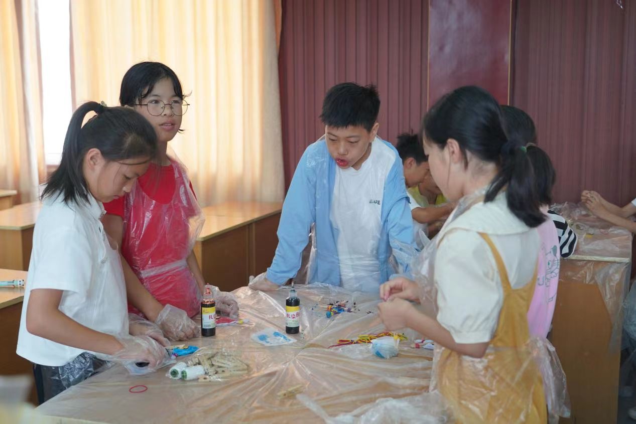 7月24日上午,扎染課程在高塘學(xué)校如期舉行。朱老師首先向?qū)W生們介紹了扎染的歷史淵源和基本原理,激發(fā)了學(xué)生們對這門古老技藝的好奇心和探索欲。隨后,學(xué)生們在朱老師的指導(dǎo)下,分組合作,動手實(shí)踐。他們用皮筋、夾子、彈珠等工具創(chuàng)作出各種各樣的圖案,“你的愛心可真好看”,“我的笑臉更好看”孩子們激動地說道。最后,學(xué)生們再將染料涂抹在布料上。隨著顏料的滲透與擴(kuò)散,一幅幅色彩斑斕、風(fēng)格各異的扎染作品逐漸呈現(xiàn)在大家眼前。