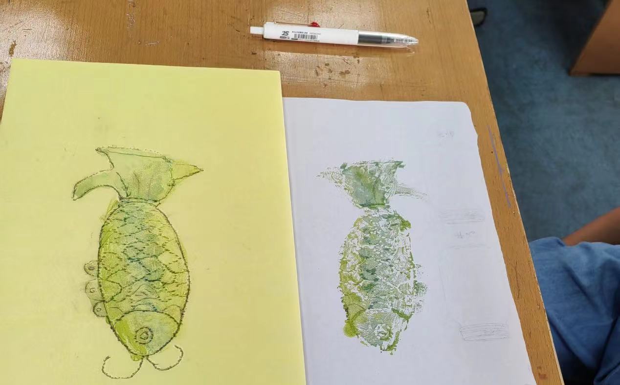 在課堂上,小分隊(duì)成員們通過生動的講解和示范,引導(dǎo)學(xué)生們了解魚拓技藝的歷史淵源與獨(dú)特魅力。學(xué)生們在動手實(shí)踐中,同學(xué)們用鉛筆或細(xì)筆在KT版上勾勒出魚的輪廓和細(xì)節(jié),每一條線條、每一個弧度都力求精準(zhǔn)。上完色后,學(xué)生們將紙輕輕覆蓋在KT版上,輕輕拍打紙張背面,使顏料均勻轉(zhuǎn)印到紙上。隨著紙張的緩緩揭開,一幅幅精美的魚拓作品便呈現(xiàn)在大家眼前。