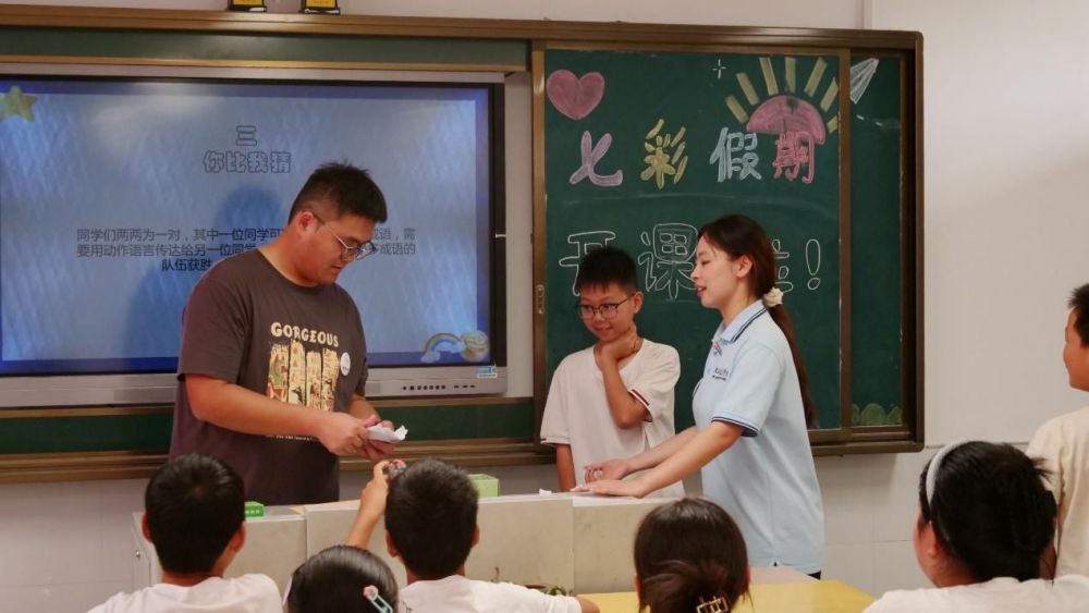 開班第一天,隊員們作為各班級帶班老師走進教室開啟七彩假期第一堂課,帶班老師著重強調(diào)了防溺水安全和交通安全問題。向孩子們介紹本次七彩假期內(nèi)容豐富的課程,包括古典舞、拉丁、美工、體育、心理、科學(xué)小實驗等,以及形式多樣的特色活動,包括制作回憶錄、積分拍賣會。