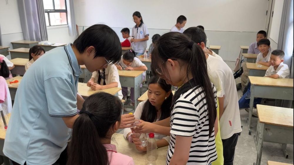 圖為隊員帶領(lǐng)同學(xué)們上科學(xué)小實驗課程