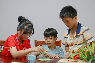 折紙課堂上,“油你成蔭”實(shí)踐團(tuán)教孩子們制作千紙鶴、桃子、風(fēng)車等折紙工藝品。“油你成蔭”隊(duì)員認(rèn)為,折紙,不僅可以鍛煉孩子們的手部動(dòng)作和專注力,還能讓他們體驗(yàn)到手工藝品制作的樂趣和成就感。