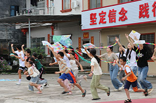 圖為“油你成蔭”實(shí)踐團(tuán)與孩子們放風(fēng)箏。梁宇欣 攝