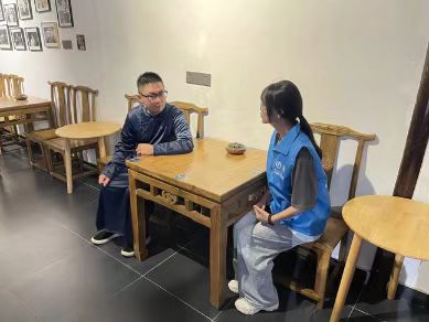 圖為劉姝怡(右)采訪非遺傳承人戴杰(左)。大學(xué)生之聲通訊員吳昊攝