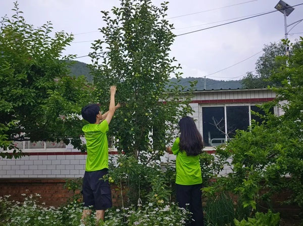 圖為志愿者在村民家里幫忙摘果子。 史子儀 攝
