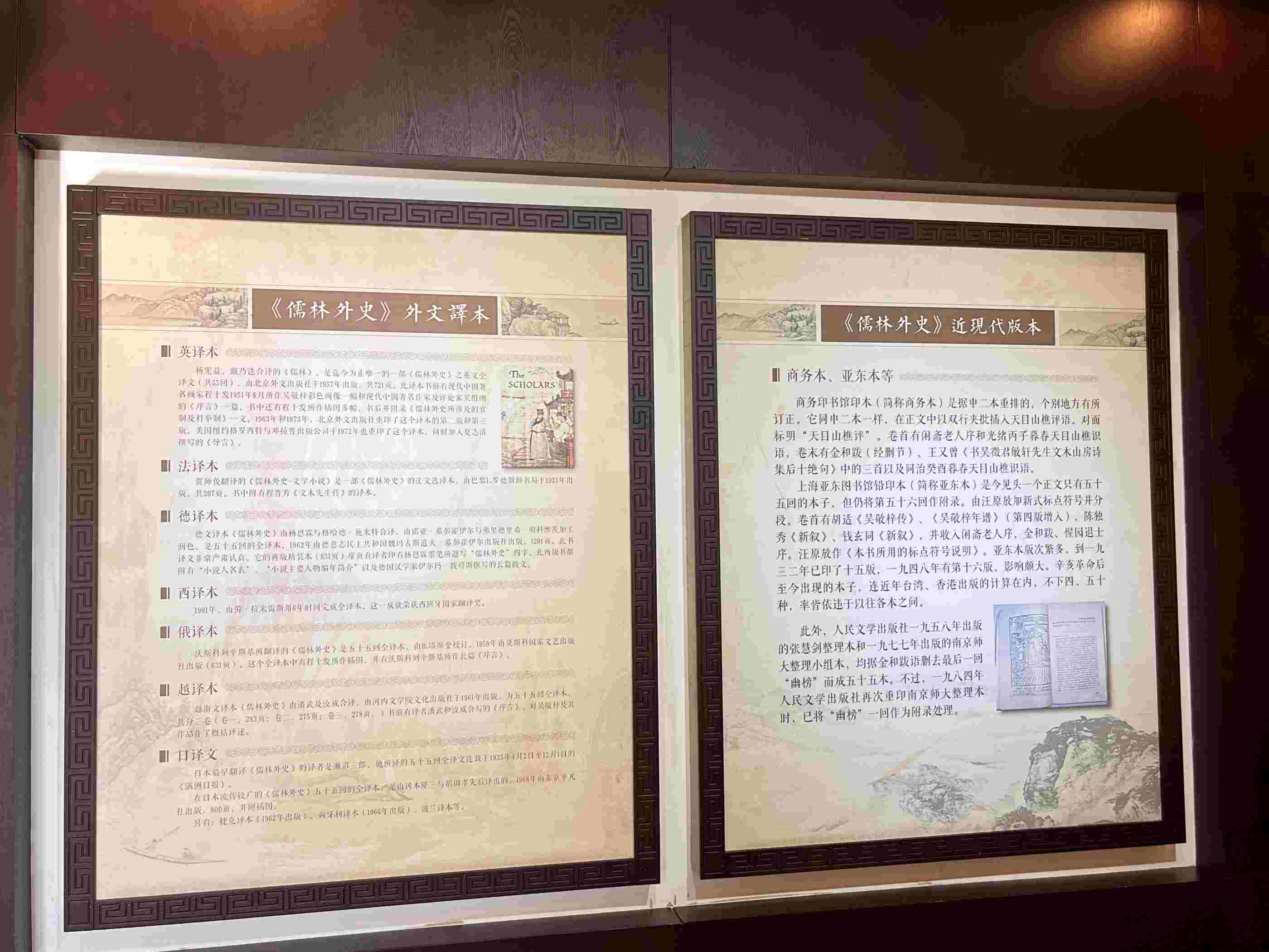 圖為《儒林外史》各種版本記載。于是隨后團(tuán)隊(duì)成員便來到全椒縣吳敬梓紀(jì)念館。全椒縣吳敬梓紀(jì)念館主體建筑坐北朝南,裝飾手法以明清風(fēng)格為前提,分為三廳兩廡兩回廊組成的仿明清風(fēng)格的古典式建筑,既收南方園林之秀,又納北國(guó)古建之雄。紀(jì)念館設(shè)門廳、過廳、正廳、展廳四部分,運(yùn)用版面、燈箱、通柜、獨(dú)立柜、塑像等不同表現(xiàn)形式??傟惲姓褂[面積為1600平方米,共7個(gè)展廳,分別為:分為:吳學(xué)研究資料廳、吳敬梓家世廳、吳敬梓生平廳、正廳、衣冠冢、西墅草堂、接待室。館內(nèi)藏品主要來源于考古發(fā)掘、社會(huì)捐贈(zèng)、征集等。藏品類別有石刻、陶瓷器、青銅器、字畫等。