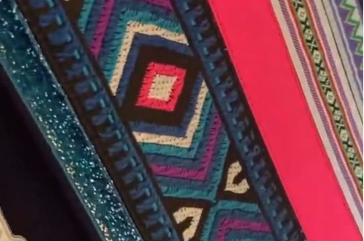 至此,我心中的壯服仍是不可觸碰的。它或是那一件艷麗的朱紅成衣,或是細(xì)線繡成的古樸花紋,或是未繡完的壯紋針痕,或是伏案工作者經(jīng)年累月勞作的心血,或是展覽品一旁所標(biāo)注的禁止觸碰。而在成衣間的零距離接觸,讓我真正地感受到了壯服的溫度。在工作人員的同意下,我的指尖撫摸過了起伏不平的布面。針線痕鋒利,那流動鮮明的顏色色也變得堅(jiān)硬了起來,稍稍一用力會在指腹上留下淺淡的痕跡。天紋地紋的井字紋刺繡排列得如此整齊,傳承人卻告訴我,這只是入門刺繡的聯(lián)系品。我四下環(huán)顧,看到更復(fù)雜所需技術(shù)更精湛的壯紋,或是天地紋或是走獸紋,刺繡學(xué)徒還要再刺繡兩三年的井字紋才能參與工藝品的制作,而傳承人則需要再刺繡少則半年多則幾年的花紋,才能完成手中的工藝品。