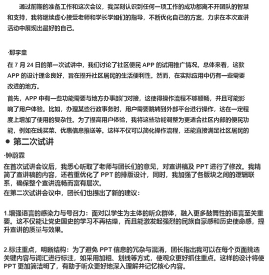 在暑期實(shí)踐開展過程中,成員們積極準(zhǔn)備宣講內(nèi)容,完成工作任務(wù),認(rèn)真思考并修改出現(xiàn)的問題,不斷總結(jié)反思,在每次例會(huì)之后撰寫團(tuán)隊(duì)成員的會(huì)議心得。