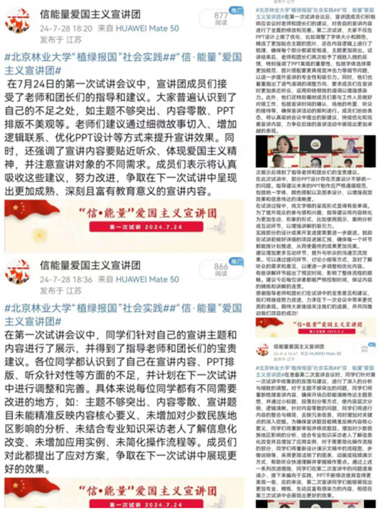 實(shí)踐開展情況 截止到目前,“信·能量”愛國主義宣講團(tuán)在線上完成了第一、二次試講,擬前往鄉(xiāng)村振興一線、西部基層一線、社區(qū)服務(wù)一線,深入學(xué)習(xí)二十大,以時(shí)代楷模為榜樣,探訪中國式現(xiàn)代化的奮進(jìn)之路,制作了PPT、實(shí)踐方案與講稿。