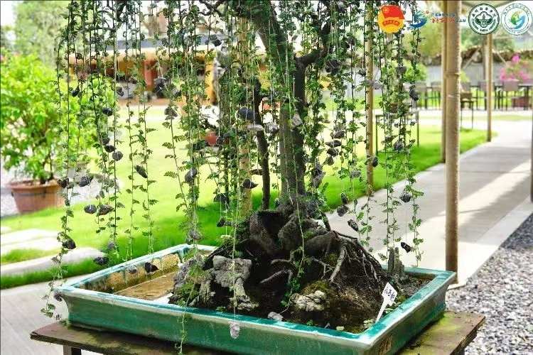 丹霞小石積是薔薇科小石積屬植物,通常高達(dá)1-3米,呈小枝圓柱形,奇數(shù)羽狀復(fù)葉,具小葉片7-15對(duì)。為了讓枝條像瀑布一樣向下生長(zhǎng),每一個(gè)枝干上綁著一顆顆小石頭,具有很高的盆景觀賞價(jià)值。