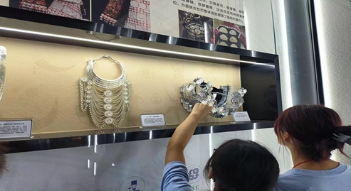 圖為團(tuán)隊(duì)成員欣賞苗族銀飾
