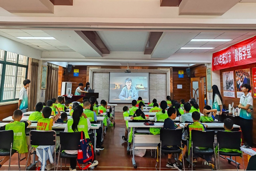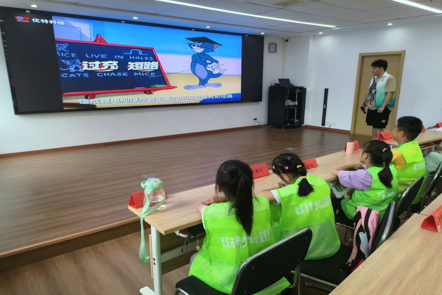 圖為源和鋰電池暑期社會(huì)實(shí)踐團(tuán)隊(duì)初次進(jìn)入武漢市東西湖區(qū)金銀湖社區(qū)托管班開展宣講活動(dòng),為托管班學(xué)生們播放視頻介紹鋰電池有關(guān)知識(shí)。李雯婕 供圖