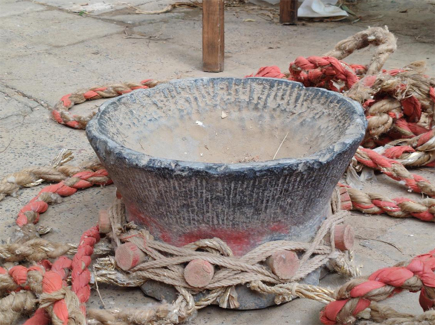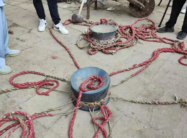 王老師為實(shí)踐團(tuán)講述硪的來(lái)源,硪是砸實(shí)地基的一種勞動(dòng)工具,當(dāng)時(shí)的硪通常由石質(zhì)或鐵質(zhì)材料制成,十分沉重,形狀一般為圓形,硪的具體形制和大小可能會(huì)有所不同,其重量也有差異,常見(jiàn)的硪重量從25公斤到180公斤不等。說(shuō)罷并從房子里拿出來(lái)兩個(gè)硪,一個(gè)是由石質(zhì)制成,大約有80斤;另一個(gè)由塑料制成,用于表演工具。王老師還講述了在打硪時(shí)需要一種民間歌謠,這種歌謠旋律樸實(shí)、節(jié)奏明快、雄渾有力。