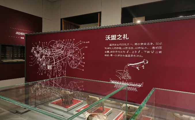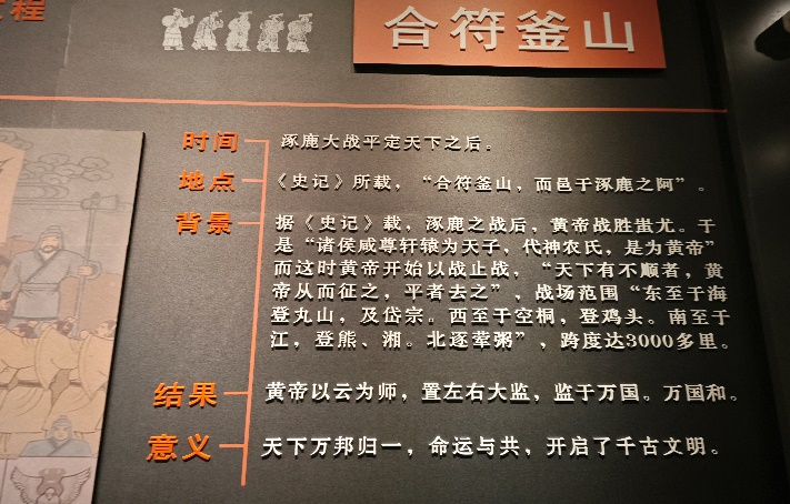 三、史書層層 走進(jìn)博物館團(tuán)隊(duì)成員又來(lái)到涿鹿博物館,三角形的建筑獨(dú)居特色,象征著三祖交匯,在工作人員的帶領(lǐng)下,團(tuán)隊(duì)成員參觀了涿鹿從炎黃時(shí)期到現(xiàn)代的歷史種種:祭祀古器斑駁,歷史記載永恒,其中,沃盥之禮是重要的祭祀儀式,盥洗是古代儀禮之一,用水使身潔凈,以示對(duì)神對(duì)人的恭敬。以匜注水,以盤接水,二者相互配套。上下二者甲骨文相合,像一只手放在盆里承水沖洗。團(tuán)隊(duì)成員了解到阪泉之戰(zhàn)、涿鹿之戰(zhàn)等記載在歷史課本上的重要?dú)v史事件,成員深深體會(huì)到這些古文物所承載的歷史之悠久與厚重,仿佛穿越千年,再次來(lái)到這片土地上。