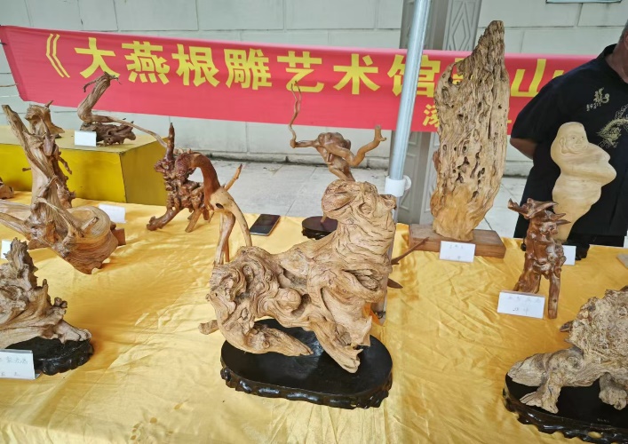 與工作人員交談得知,當(dāng)?shù)鼐皡^(qū)文創(chuàng)仍以簡(jiǎn)單的紀(jì)念幣、明信片為主,并未發(fā)展出具有黃帝城特色的成熟文創(chuàng)產(chǎn)品。因?yàn)榈昝婢S修的緣故,團(tuán)隊(duì)成員未能參觀文創(chuàng)商店,而值得一提的是,在景區(qū)門外有售賣根雕藝術(shù)的商販,商品形態(tài)各異,以山海經(jīng)等古籍里神獸與黃帝麾下神將形象為模板進(jìn)行,栩栩如生??梢娡饨缥膭?chuàng)業(yè)較為成熟,且具有當(dāng)?shù)靥厣?,而官方文?chuàng)店并未創(chuàng)新,兩者并未緊密結(jié)合。